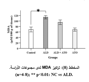 كما أظهرت النَّتائج انخفاضاً في مستويات MDA لدى المجموعة الوقائيَّة ((ALD+ATO (95.42 ± 8.42 μM/100g)، ولم يكن هناك فارقٌ مهمٌّ إحصائيَّاً مقارنةً بالمجموعة المَرَضيَّة (ALD) حيث كانت مستويات MDA (113.92 ± 6.20 μM/100g)، وكذلك لم يكن هناك فارقٌ مهمٌّ إحصائيَّاً مقارنةً مع المجموعة الشَّاهدة الطبيعيَّة (NC).