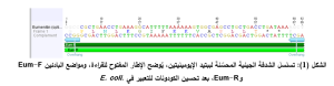 صُمم جين ببتيد الإيومينيتين (Eumenitin) بناءً على تسلسل الأحماض الأمينية المستخلص من البنية الفراغية للبروتين المرجعي المسجل في قاعدة بيانات PDB (ID: 2N9A, Chain A)، وقد تم تحسين الكودونات لتتلاءم مع نظام التعبير في E. coli بهدف رفع كفاءة الترجمة [12]. جرى تجميع التسلسل باستخدام تقنية One-pot assembly من oligonucleotides مصممة خصيصًا من مسبرين متتامين الجدول (1)، مع إدراج مواقع إنزيمات التقييدApaI وHindIII، بالإضافة إلى موقع إنزيم TEV protease ووسمة- Tag .His6