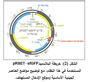 تمت عملية التعبير البروتيني وفقًا لدراسة Sambrook وآخرون [14]، فبعد تحوير خلايا E. coli BL21 (Gold) بالبلاسميد pRSET-sfGFP باستخدام الصدمة الحرارية، زُرعت المستعمرات المختارة في وسط (LB) يحوي على المضاد الحيوي كاربنسيلين. عند وصول النمو البكتيري إلى كثافة ضوئية (OD600 ≈ 0.6)، تم تحفيز التعبير البروتيني بإضافة IPTG بتركيز 0.3 مليمول/لتر، مع متابعة التحضين عند 28°م لمدة 16 ساعة.