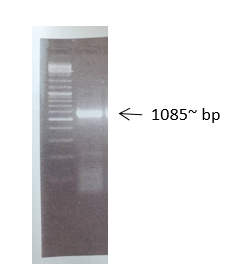الشكل (4): حزمة الإيومنيتين المؤشب بالحجم المتوقع 1085 ~bp بعد الهضم باستخدام إنزيمي ApaI و.HindIII