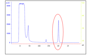 تم استخلاص البروتين المنتج في خلايا البكتيريا من السيتوبلازم بعد 16 ساعة من التحريض، تلا ذلك تنقية البروتين المؤشب DECO-sfGFP باستخدام عمود كروماتوغرافيا الإلفة المعدنية المشحون بأيونات النيكل على جهاز AKTA Prime System. أتاح كاشف الأشعة فوق البنفسجية (UV) المدمج في هذا النظام المراقبة الفورية والمباشرة لجميع مراحل عملية التنقية (الشكل 6) و جمع البروتين المؤشب.