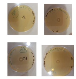 تم تقييم النشاط المضاد للجراثيم للببتيد المؤشب من نوع الإيومينتين باستخدام اختبار كيربي-باور ضد أربع سلالات جرثومية معيارية الجدول (2). أظهرت النتائج أن الببتيد المؤشب أحدث مناطق تثبيط واضحة في السلالتين إيجابيتَي الغرام ، حيث بلغ متوسط قطر منطقة التثبيط ضد S.aureus 17.3 ± 0.5 مم، وكان L.monocytogenes 15.9 ± 0.7 مم الشكل (7). أما في السلالات سلبية الغرام، فقد لوحظ نشاط مضاد للميكروبات ولكن بدرجة أقل، حيث بلغ متوسط قطر منطقة التثبيط ضد S. enterica 11.2 ± 0.6 مم، وضد Y. enterocolitica 10.5 ± 0.8 مم، مع تسجيل بعض حالات النمو الجزئي قرب حدود مناطق التثبيط.