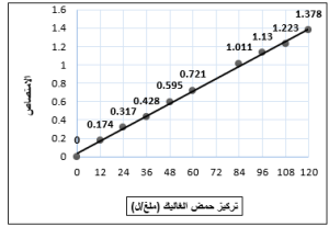 يُبيّن (الشكل 1) الخط البيّاني الممثل لخطّيّة حمض الغاليك، والذي يُظهر متوسط المُكررات الثلاثة لقيم الامتصاص الموافق لكلّ تركيز مع تراكيز السلسلة العياريّة. حيث نلاحظ أنّ الطريقة المُتبعة تتمتّع بخطّيّة ممتازة وبقيمة مُعامل ارتباط R2=0.998