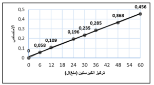 يُبيّن (الشكل 2) الخط البيّاني الممثل لخطّيّة الكيرستين، والذي يُظهر متوسط المُكررات الثلاثة لقيم الامتصاص الموافق لكلّ تركيز مع تراكيز السلسلة العياريّة. حيث نلاحظ أنّ الطريقة المُتبعة تتمتّع بخطّيّة ممتازة وبقيمة مُعامل ارتباط R2=0.99