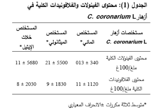 تم تحديد محتوى أزهار C. coronarium L من الفينولات باستخدام ثلاثة مستخلصات. يُبيّن الجدول التالي (الجدول 1) محتوى الفينولات الكُلّيّة في العينات المدروسة، حيث تمّ تعويض متوسط المُكررات الثلاثة للامتصاص في معادلة الخط البياني الناتج عن خطية حمض الغاليك: