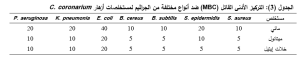أجري تخطيط العزلات على أطباق مولر هنتون اغار MHA وتحضين الأطباق بحرارة 37°م لمدة 24 ساعة، ثم اختيار المستعمرات المعزولة جيداً لتحضير معلقات البكتريا. وحضر معلق من كل عزلة بتركيز 0.5 ماكفارلاند بالقياس بواسطة جهاز العكارة الآلي. وحضرت تراكيز 5، 6.25، 10، 20، 40، 80، 160 ملغ/مل من المستخلصات المجففة باستخدام الماء، الميتانول، خلات الايتيل كلاً على حدة مع إضافة DMSO المعقم بالترشيح (مرشح معقم قطر ثقوبه 0.20 مكم) بنسبة 0.5% لإذابة المستخلصات ويكمل الحجم إلى 95 مكل بواسطة مرق مولر هنتون (MHB). وأضيف 5 مكل من معلق البكتريا إلى كل أنبوب، وحضنت الأنابيب بعد الرج بدرجة الحرارة المناسبة للنمو (37°م) لمدة 24 ساعة، واستخدم مرق مولر هنتون مع DMSO (0.5%) بدون إضافة المستخلصات كشاهد. وتم حساب قيمة التركيز الأدنى القاتل للبكتريا (MBC): بعد انتهاء فترة التحضين، نقل 10 مكل من كل أنبوب ويزرع على طبق بتري يحوي وسط مولر هنتون أغار (MHA)، وحضنت الأطباق الملقحة بحرارة 37°م لمدة 24 ساعة. وسجل ظهور نمو مرئي للمستعمرات (أو غيابه) على أطباق MHA بعد التحضين. وسجل أقل تركيز من المستخلص الذي يؤدي إلى عدم ظهور مستعمرات مرئية على أطباق MHA على أنه هو قيمة MBC.